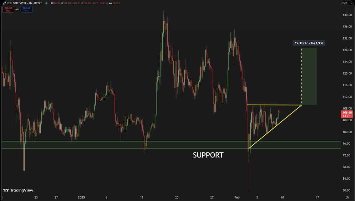 Tanınmış kripto analisti Carl Moon, Litecoin’in 96 dolarlık önemli destek seviyesinden sıçradığını ve şu anda yükselen üçgen formasyonu içinde işlem gördüğünü belirtti. Bu formasyonun yukarı yönlü kırılması durumunda fiyatın 128 dolara ulaşabileceğini ifade etti.