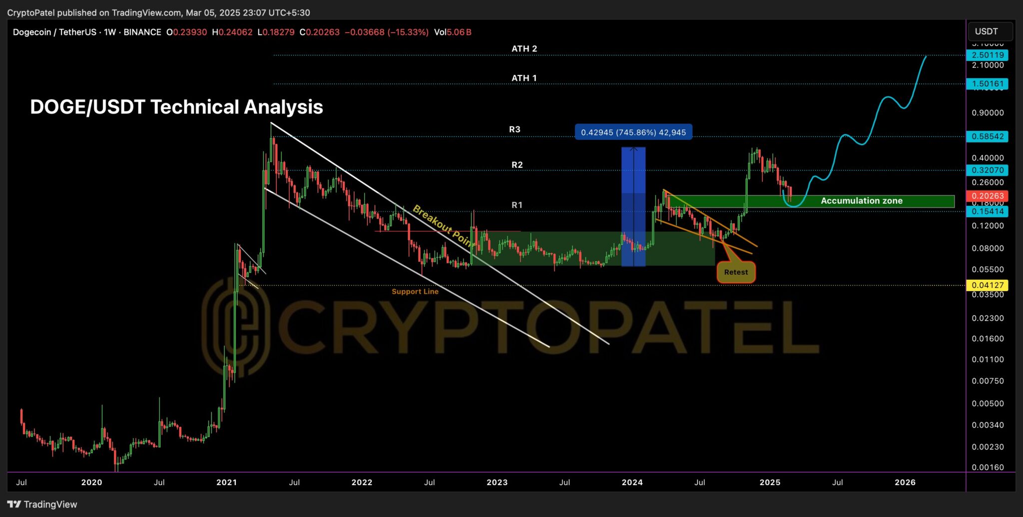 Crypto Patel’in analizinde, Dogecoin fiyatı bu birikim bölgesi tarafından tetiklenen 2,5 dolara ulaşmaya hazırlanıyor. Crypto Patel tarafından sunulan teknik analiz tablosu, Dogecoin’in tarihsel kalıpları tekrarladığını gösteriyor. Grafiğe göre, 0,320 dolar, 0,585 dolar, 1,501 dolar ve 2,5 dolar Dogecoin’in önümüzdeki kritik seviyeler.