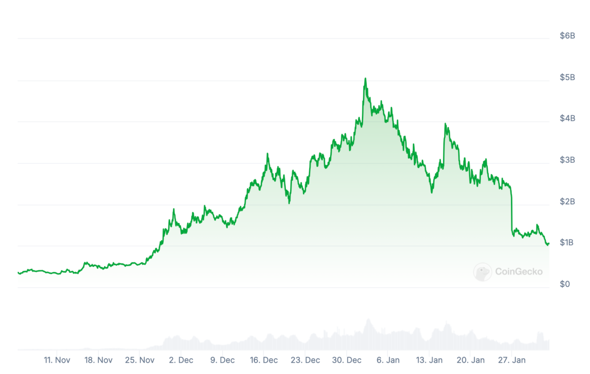 VIRTUAL, yapay zeka tabanlı kripto projelerinin yaşadığı düşüşün en çarpıcı örneklerinden biri oldu. 2 Ocak’ta, TAO ve RENDER üzere büyük AI token’larını geride bırakarak piyasa kıymeti 5 milyar dolara ulaşmıştı.